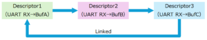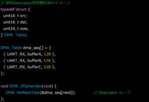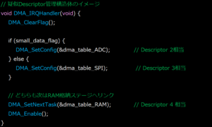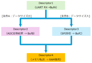 DMAの設定内容(転送元・転送先・サイズ・次の指定)を「ディスクリプタ(構造体)」にまとめ、DMAハードがその転送内容にしたがい、自動で転送を実行する仕組みです。