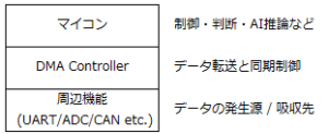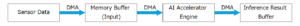 センサやカメラ  →  DMAでメモリバッファへ  →  AIアクセラレータへ転送  →  結果読み出し